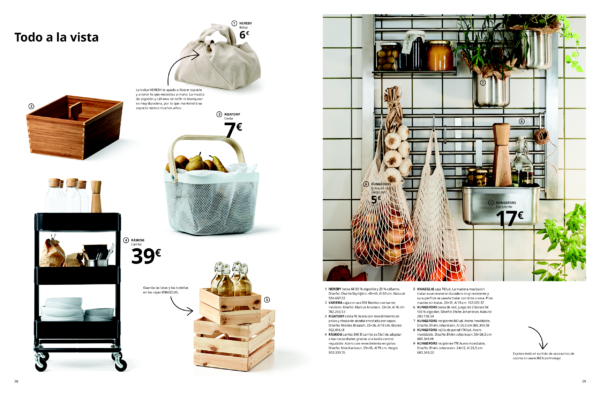 El almacenaje de cocina es también protagonista en este nuevo catálogo de IKEA, donde vamos a destacar no solo la posibilidad de encontrar baldas y estanterías abiertas, también la posibilidad de encontrar cestas y todo tipo de tarros para un almacenamiento cómodo, a la par que estéticamente bonito.