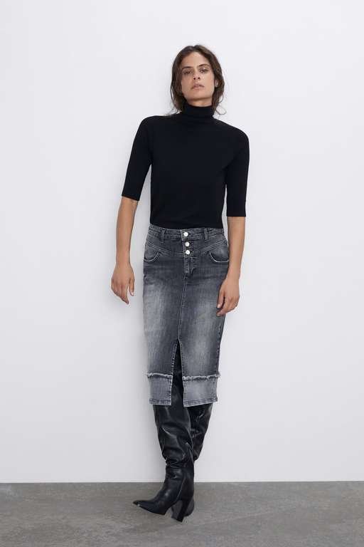 De este modo, nos podemos decantar por modelos como la falda que os mostramos a continuación. Una falda tejana de ZARA en un acertado color gris, combinada con un jersey en color negro, y además con unas botas altas.