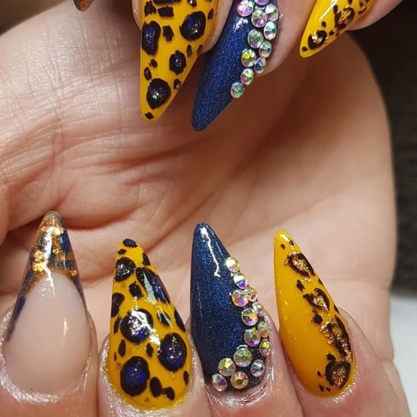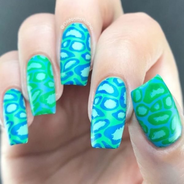 En cuanto a colores, parece que siempre nos acabamos decantando por tonos rojizos, marrones, negros o el blanco y negro que ya vimos para el estampado de cebra, pero lo cierto es que los diseños animal print para uñas, se mueven en una infinidad de colores entre los que elegir. Podéis lucir así, unas uñas con estampado animal en azul y verde como estas que os mostramos a continuación.