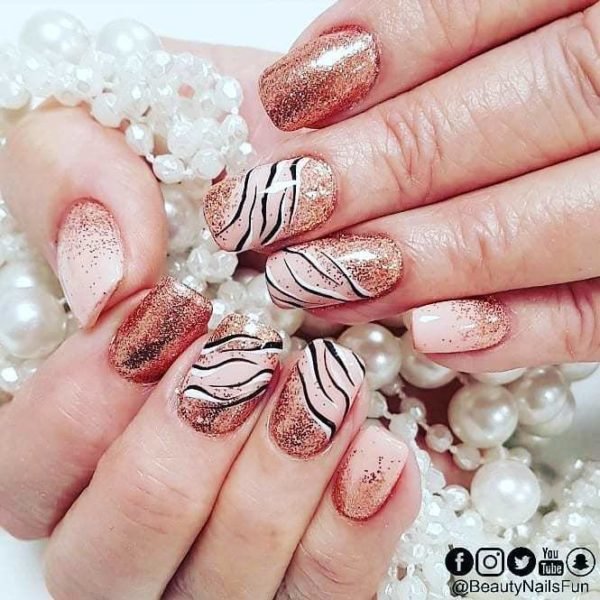 Por otro lado, si deseas que tus uñas con estampado animal print resalten de un modo significativo, nada como elegir un acabado o un esmalte que contenga glitter. De este modo, lograrás que tus uñas se vean a la última como en este diseño que os mostramos a continuación, en el que las líneas que forman el estampado animal se combinan con detalles en glitter rosado que nos parece ideal.