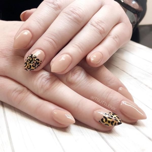 En este otro diseño vemos lo bonitas que quedan unas uñas animal print con la elección de un color o tono nude, pero además combinado con el hecho de dejar un par de uñas recubiertas por esmalte glitter.