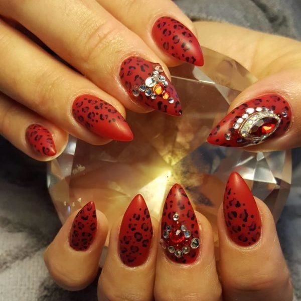 Las uñas animal print se prestan también mucho a que sobre estas coloquemos algunas piedras o brillantes que por otro lado, son también tendencia. Por ello, os podéis decantar por un diseño de uñas como estas que os mostramos a continuación, como estas en un llamativo color rojo, resaltando además muchísimo gracias a esas piedras grandes que han pegado encima.