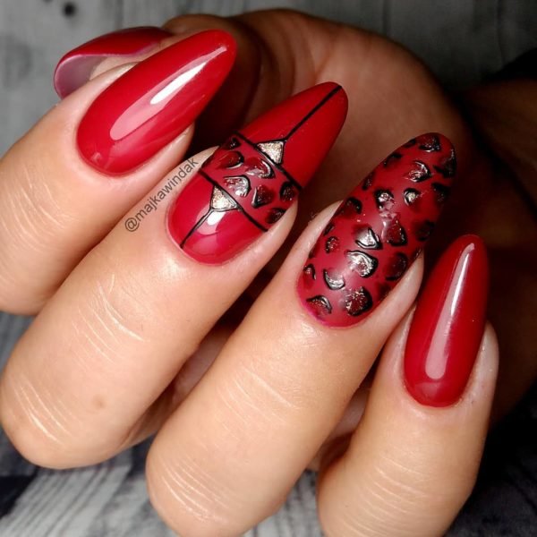 El rojo es otro de los colores que también se prestan a que decoremos nuestras uñas con un esmalte de este tono, para luego aplicar encima el estampado animal que más nos guste, utilizando otro esmalte en color negro.