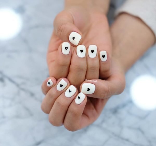 Comenzando nuestro repaso a las uñas blancas, queremos hablaros de aquellos diseños que son tendencia y de este modo, podemos elegir una manicura como la que veis a continuación, que cuenta con unas uñas blancas sin más y un dibujo de corazones en negro, que puede ser ideal para el día de San Valentín por ejemplo.