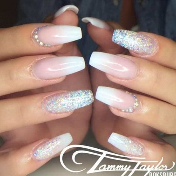 Los diseños con esmalte glitter es algo que también combina muy bien con las uñas blancas. De este modo, podéis decantaros por diseños como las uñas que podéis ver a continuación; unas uñas blancas combinadas con esmalte transparente que deja un par de uñas para cubrirlas por completo con glitter o con purpurina.