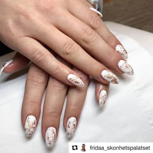 Otro de los dibujos o diseños básicos que podemos encontrar para las uñas blancas es el de efecto mármol. Un diseño que se va a llevar muchísimo por lo que podemos hacer lo siguiente: pintar las uñas de blanco y luego coger un esmalte en un color metalizado y aplicarlo como si fueran manchas de modo que quedará ese efecto mármol que es ideal para ocasiones especiales.