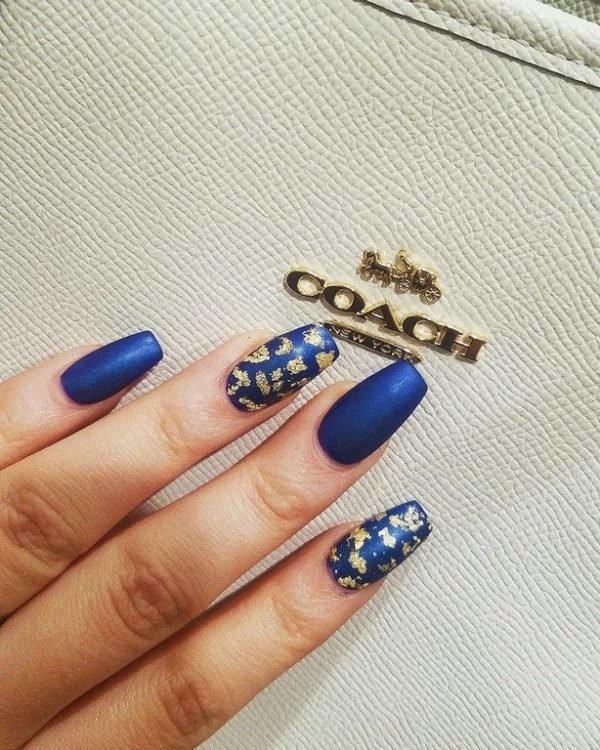El color de unas uñas doradas se puede combinar también con el color azul, que es otro de los tonos tendencia de la temporada. De este modo, podemos elegir una base de color en azul como en esta propuesta que vemos a continuación, y decorarla con unas ligeras manchas en dorado. Una mezcla de colores ideal y muy moderna.