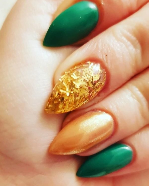 De la misma manera que podemos combinar el color dorado con el azul, tus uñas doradas se pueden combinar perfectamente con el color verde, tal y como vemos a continuación, en este diseño de uñas en el que además un color liso dorado y con glitter, se combina con un color verde muy llamativo.