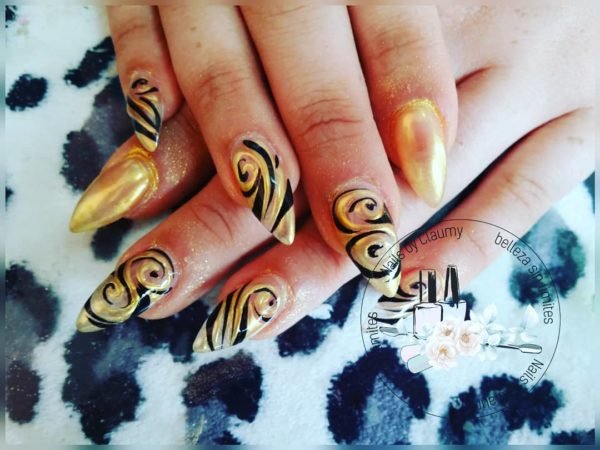 Las uñas doradas se pueden llevar con infinidad de diseños que por otro lado, también marcan tendencia. Uno de estos diseños será el que veis a continuación; un diseño de uñas doradas combinado con el color negro para formar unas ondas ligeras y de este modo, conseguir así un estilo elegante.