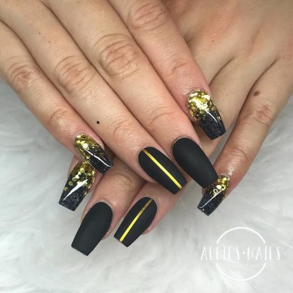 Por otro lado, el diseño de las uñas doradas se puede combinar con dibujos de rayas que son también tendencia. Si queréis crear un diseño que sea elegante y que cuente con este dibujo, nada como hacer algo parecido a lo que podéis ver en esta otra imagen, que cuenta con el dorado, pero además utiliza también el color negro.