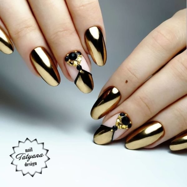 Seguimos viendo cuáles son las mejores propuestas para vuestras uñas doradas y si bien ya vimos antes, algunas ideas con piedras o brillantes, podemos sumarle también las uñas con efecto espejo que marcan tendencia, como en la propuesta que vemos a continuación, que además combina la presencia de unas pequeñas piedras en dorado.