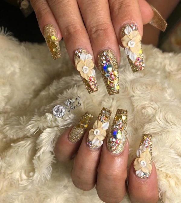 Por otro lado, las uñas doradas se pueden combinar también con las piedras y brillantes que son tendencia. En este sentido, conseguirás como hacer que tus uñas resalten completamente y llevar así una propuesta como la que os mostramos a continuación, con un ligero esmalte en dorado, decoradas con unas piedras o detalles grandes, incluso formando flores.