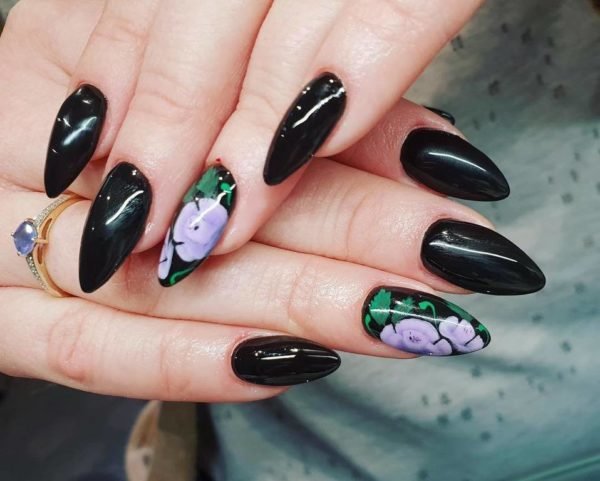 También podemos elegir diseños de uñas flores en las que los tonos a combinar sean todo lo contrario, es decir, podéis elegir unas uñas de flores como las que vemos a continuación, en la que el dibujo en lila y verde, combina además con un brillante color negro. Un diseño que es igual de elegante al anterior y resulta perfecto para ocasiones especiales.