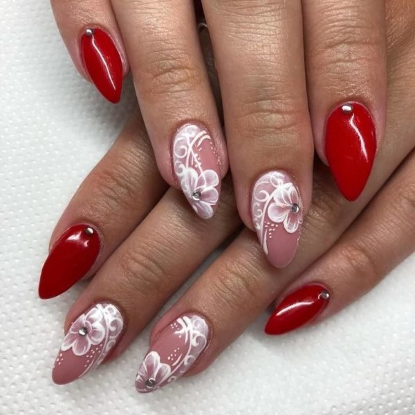Otro diseño puede consistir en elegir un color básico como el blanco para poder dibujar flores como las que vemos en este otro diseño, combinando con un llamativo color rojo.