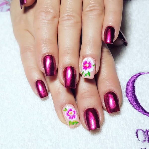 De manera especial os queremos hablar también de los diseños uñas de flores apostando además por un acabado que sea metalizado. De este modo, podemos decantarnos por un estilo de diseño de uñas como el que vemos a continuación, en el que dos uñas cuentan con el dibujo de las flores, mientras que el resto se pinta con un efecto metalizado en coloro rosado, para crear una mezcla realmente llamativa.