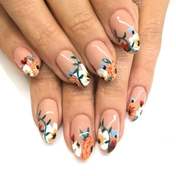 En cuanto a los colores que podemos elegir para combinar con esos diseños tendencia para vuestras uñas con flores, os recomendamos sobre todo la apuesta por los que son colores neutros o tonos nude, así como los tonos pastel, ya que son estos los que marcarán tendencia este año. Para ello, podemos elegir un diseño como este, en el que vemos un tono neutro rosado, dejando la punta para poder dibujar las flores.