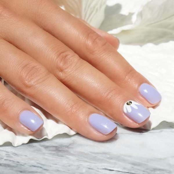 Por otro lado, también podemos decantarnos por un diseño de uñas con flores que sea muy básico o sencillo y de este modo poder lucir vuestras uñas decoradas para todas las ocasiones. Así, podemos hacer como vemos en esta imagen, con unas uñas en color lila, dejando una sola para poder pintar sobre ella, una pequeña flor en la punta, de color blanco.