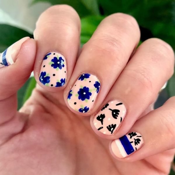 Por último queremos mostraros también la posibilidad de ver como las uñas flores se van a poder llevar también con unas uñas cortas. En este sentido, podéis decantaros por diseños como el que veis aquí, en el que las flores se combinan con un tono de base blanco, con flores en azul o en negro. Un diseño de uñas que será perfecto para el día a día y también porqué no, para ocasiones especiales en las que desees lucir una uñas bonitas sin tener que recurrir a unas uñas postizas.