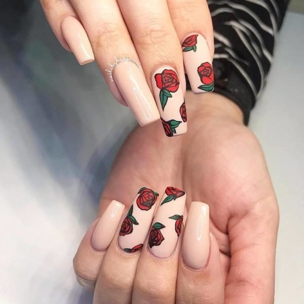 Por otro lado, podemos decantarnos también por las uñas flores que tengan un acabado de efecto o estilo mate. De este modo, podrás decantarte por un diseño de uñas como el que os mostramos a continuación, en el que se apuesta por un esmalte mate en un tono rosado, combinado con el dibujo de unas flores en rojo y verde para crear una combinación de tonos y acabado que aportarán mucha elegancia a nuestras uñas. Un diseño especialmente indicado para ocasiones especiales.