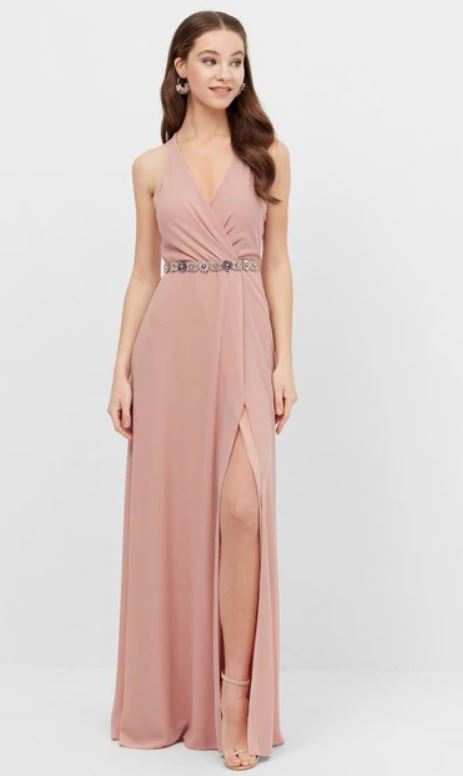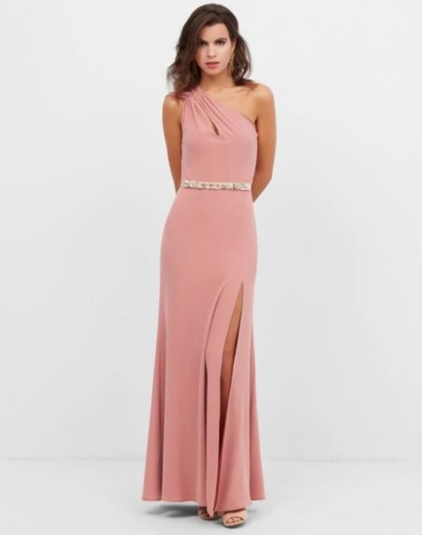 Este vestido rosado es muy buena opción para ir elegante, pero sin restarle importancia al outfit del protagonista del evento.