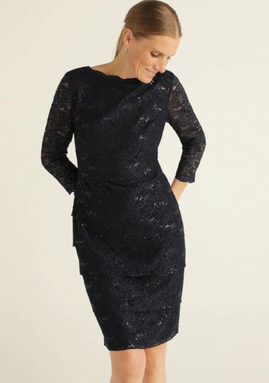 Si eres una invitada de boda, ya sea de tu mejor amiga o de un familiar, tienes que ir muy guapa, pero no tanto como para eclipsar a la protagonista del evento. El primero de estas opciones es este vestido azul marino con un escote pequeño y con unas mangas solo por los hombros.