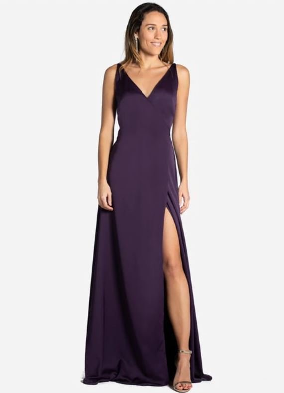 El color morado es muy buena idea para una boda, como esté con un escote abierto y con una gran abertura en la zona de la pierna izquierda; para que puedas ir elegante y cómoda.